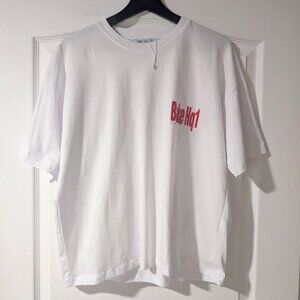 Round neck T-shirt with short drop-shoulder sleeves. Image