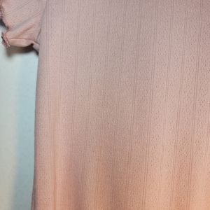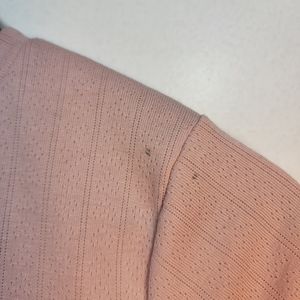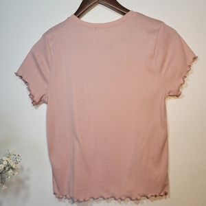 Very cute fitted pink frilled sleeve and bottom hem shirt. Cropped. Very faint heart print pattern. Slight mark as seen in picture.