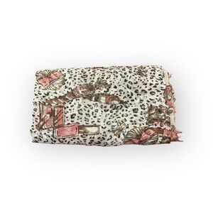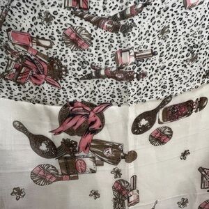 Brand new 100% poly 76in x 84in. Lightweight rose coloured with lipstick and belt motif.