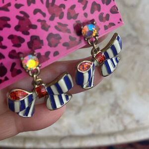 Adorable brand new Betsey Johnson dangle earrings. Pretty blue and white striped dangly ribbons with red accents. Totally giftable.
