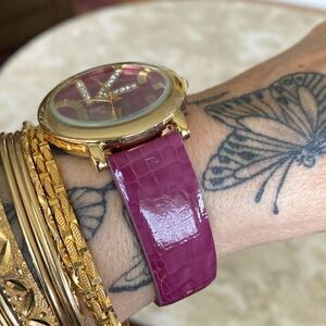 Brand new lovely quartz wristwatch in on-trend purple colour with a round dial accented with gold tone stainless steel and crystal detailing.