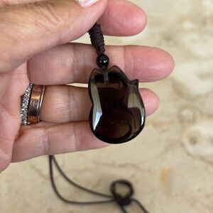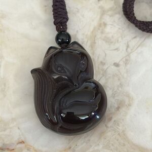 Hand Carved Engraving Natural Ice Obsidian Fox Empress Amulet pendant necklace made of 100% natural Ice obsidian gemstone.