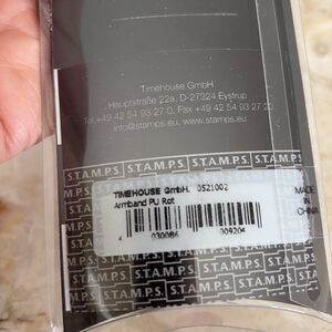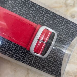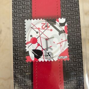 Brand new in box, funky STAMPS wristwatch, features a multicoloured square face with abstract art using red, black and grey on white. Wide red vegan leather strap and silver tone buckle.