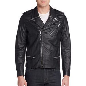 Snakeskin pattern adds edge to supple lamb leather jacket. Notched lapel. Shoulder epaulettes. Long sleeves. Zipper cuffs. Asymmetrical front zip closure.