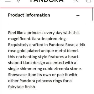 Description: feel like a princess every day with this magnificent tiara-inspired ring. Exquisitely crafted in Pandora Rose, a 14k rose gold-plated unique metal blend, this enchanting style features a heart-shaped tiara design accented with a single shimmering cubic zirconia stone. Showcase it on its own or pair it with other Pandora princess rings for a fairytale finish.