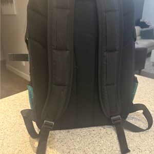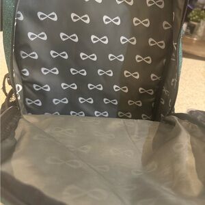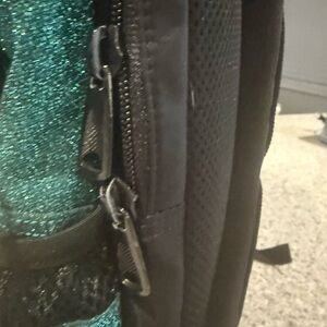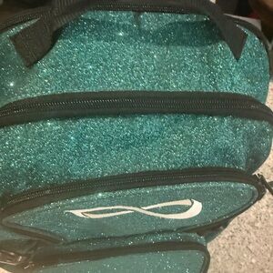 Glittery teal backpack. this backpack is used for cheer/cheerleading. Lots of compartments in place for cheer shoes. Bag is clean and in excellent condition.