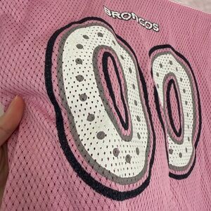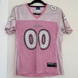 Gorgeous NFL Denver Broncos shortsleeve v-neck jersey in pink. Brand is Reebok. Jersey has some mesh and some shiny fabric as well. Super lightweight!