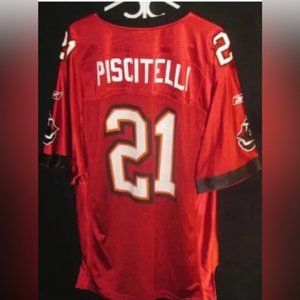 Presenting an excellent condition, vintage "Tampa Bay Buccaneers" NFL football jersey as pictured, made by Reebok, licensed NFL team apparel, team emblem patch screened on the shoulders, NFL emblem shield, player #21 Piscitelli screened on the back, 100% nylon, authentic & original, no snags/holes or stains, low bargain-priced, there are NO marks/stains on the jersey; the pictures are of poor quality...