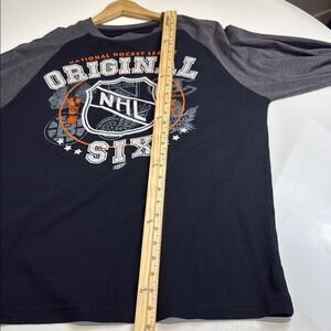 Celebrate the legacy of hockey with this NHL long sleeve tee, featuring a striking black and gray raglan design. The front showcases a vintage-style graphic with the 'ORIGINAL SIX' text and the iconic NHL logo, making it a must-have for any sports enthusiast. Perfect for casual wear, this shirt combines comfort and style effortlessly.