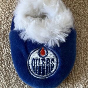Soft blue baby shoes with white fluffy trim. Features NHL logo. Perfect for little Edmonton oilers fans