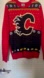 NHL sweater, in very good condition - light wash wear, small spot stain on back. Knit style, Calgary Flames emblem, festive style. Marked size small.