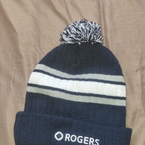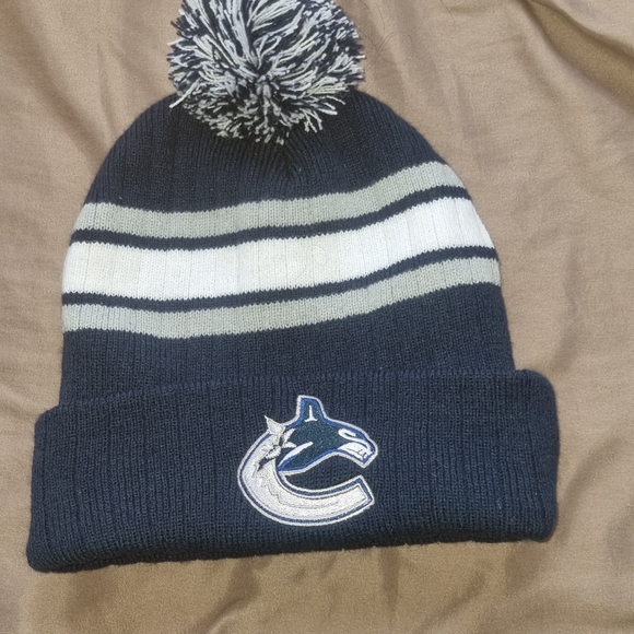 NHL knit beanie with team logo. Features navy and white stripes. Pom-pom on top.
