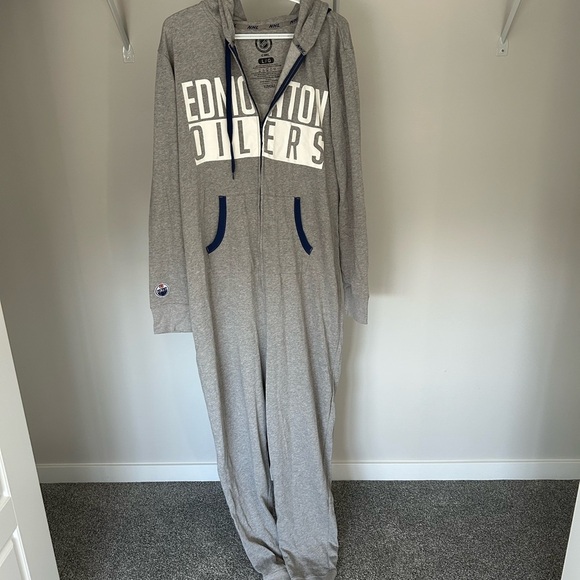 NHL Oilers branded onesie with gray and blue tones. Comfortable and stylish for fans. NWOT Large