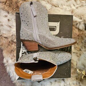 The stock photos don't do these boots justice! They are so sparkly in the light that they look like diamonds! I uploaded a short video so you could see how beautiful they are! Could be worn with your favourite jeans or for a glam Western wedding. They are size 7.5 Dingo leather rhinestone cowboy boots, new in box, with tags attached. Sorry about the top of the box. I wish they wouldn't put shipping labels right on the box, and some of the logo was removed when I took off the label. As well, the box shows rose gold size 6.5, but that is inaccurate. They are silver, 7.5. Smoke free/pet friendly home. Please see below for full description. Thank you for your time!