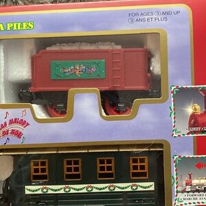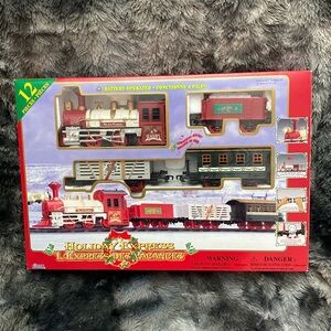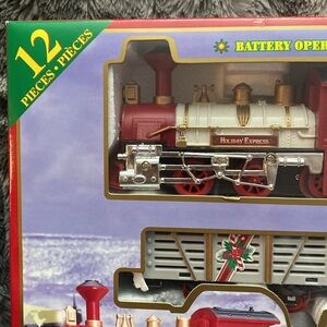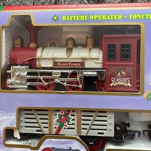 Battery-operated holiday train set in red and white. Includes locomotive and carriages with festive designs. This is untested as the box has never been opened.