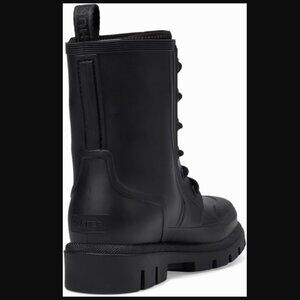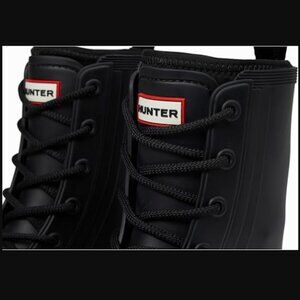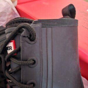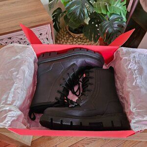 New, in box, black combat style waterproof rain boots, size 6. See below for full description. The top eye closure on one boot is ripped. See last photo. Smoke free, pet friendly home.