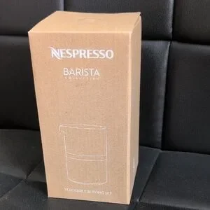 Nespresso Barista Collection stackable serving set in brown packaging. Clean, minimal design. Perfect for coffee fans and gifting.