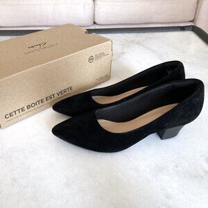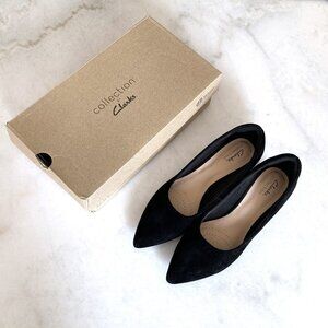 NIB / New Clarks Teresa Step black suede leather pumps / high heels / block heel shoes with pointed toe / pointy toe