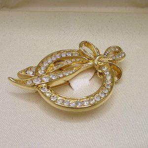 A vintage Nolan Miller crystal brooch from the late 1990s. Gold tone rhinestone ribbon ring shape. Never been worn and lovingly stored in the original box. Measures 2" x 1.5". I have more jewelry available, so you can create a bundle and let's make a deal!