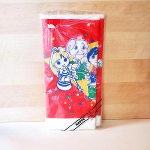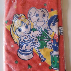 New in bag kids show Passe-Partout paper tablecloth from 1988. This was made in Canada and in collaboration with Provigo. Main colours are red with white trims and multicolour background geometric shapes, main characters are showing playing music instruments.