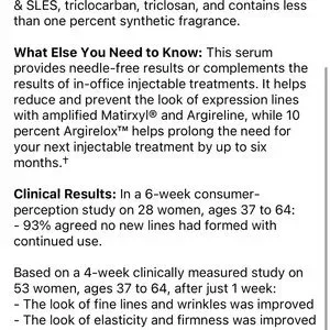 Absolutely incredible serum for plump, smooth skin. Works amazingly well to fill fine lines and creases.