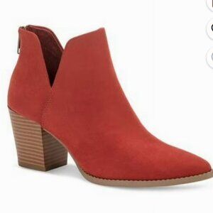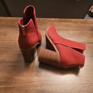 Cute booties, new in box, size 9. They are a beautiful deep red, perfect for autumn! Box and shoes don't indicate brand. I chose a stock photo that is very similar in style, but they appear to have a shorter heel. Smoke free/pet friendly home.