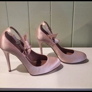 NIB Red Valentino ballet pink satin heels with bow detail ankle strap. Now can be slide to front, side, etc or completely removed. Approx 4" covered heel. Included original box and dustbag. Fits us 9