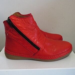 This is what AI says: The boots in the image are red ankle boots with side zippers. A visual search identifies them as having similarities to various brands and styles, including some from Miz Mooz and Orizonte. One of the most visually similar results is sold at Kunitz Shoes.