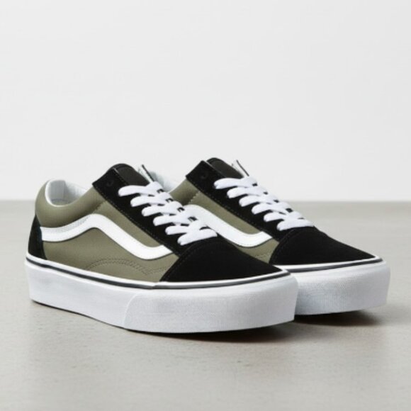 Authentic Vans Old Skool Platform Sneakers Elevate your street style with these iconic platform Vans in a versatile olive green and black colorway. Perfect for adding a bit of height without sacrificing comfort!