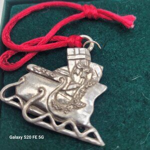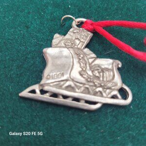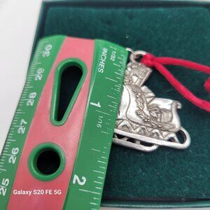 Capture the timeless elegance of the holiday season with this exquisite Seagull Pewter Canada Christmas Sleigh Ornament. Crafted in 1991, this small, silver-colored piece reflects the celebrated artistry of the early '90s. Its classic shape and design make it a charming addition to any Christmas decor, ideal for both first-time decorators and seasoned holiday enthusiasts.