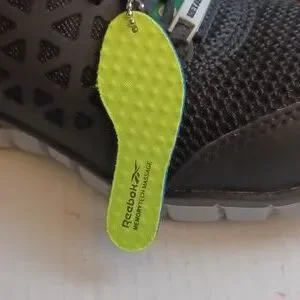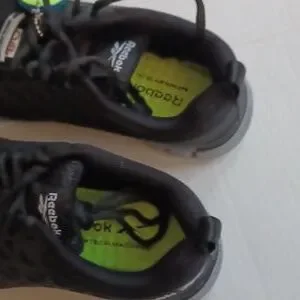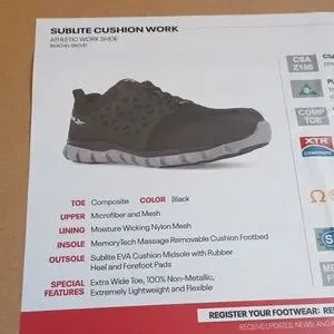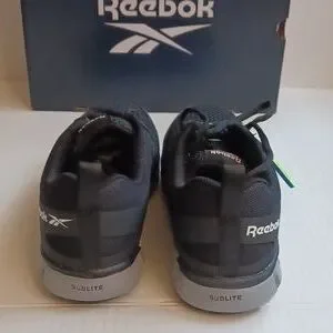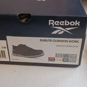 New athletic work shoes, size 3W (men), Reebok, composite toe, metal free, sublite (lightweight), MemoryTech massage removable yellow cushion footbed, black with gray accent, new in box, excellent condition.