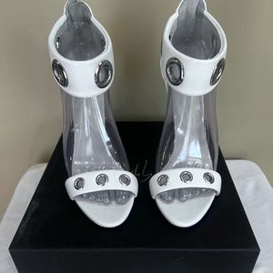 👠 WHITE HIGH HEEL SANDALS WITH SILVER CUT OUT LOOPS ON ANKLE STRAP 👠