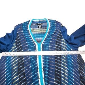 In very good pre owned condition showing no outward signs of wear. Long sleeves are in solid blue while the rest of the garment is a variegated knit of blues and yellow. Lightweight and very flattering. Photos are important so please check all for condition, detail and measurements.