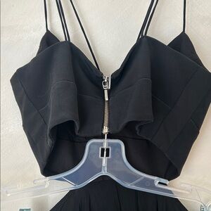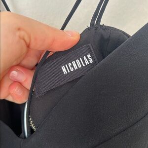 NICHOLAS Black fit & flare cocktail dress, zipper back, asymmetrical hem strappy