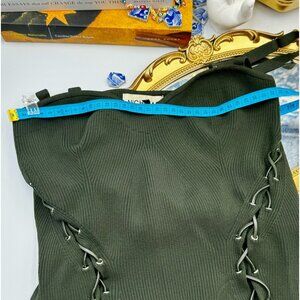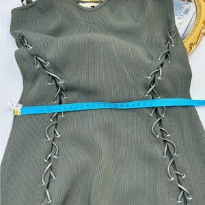 Darrk olive green ribbed knit dress from Nicholas, featuring lace-up detailing, sweetheart / square neckline, open back and adjustable spaghetti straps. This dress is fitted at the waistline and is mid-length.