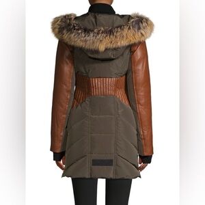 Moto-inspired down parka defined by quilted leather panels and warmed with plush, genuine fox fur around the hood. NB Series