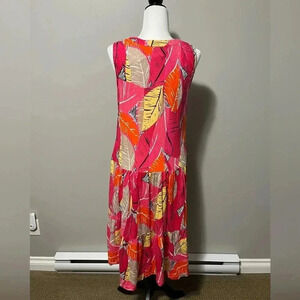 The print is an overlapping pop of stylized leaf shapes in eye-popping fun summer colors. The dramatic drape of the relaxed, pullover maxi fit adds to the falling leaf motif, and the skirt is tiered with tasteful ruffles that'll catch the echo of your every move.