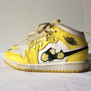 Nike Air Jordan 1 Mid SE Rose Patch in Dynamic Yellow. Size 11C girls/kids/youth White and yellow with black accents and embroidered rose patch on both sides of shoe. White and yellow lace-up closure. Pre-owned but in great condition with loads of life left in these awesome shoes. NOTE: some marks on shoe due to normal wear, such as on the soles as well as a few scuff marks here and there, but very minimal. Smoke-free, pet friendly home!
