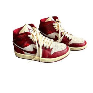 NIKE Air Jordan 1 Mid SE Lift Up Tiki Leaf Team Red/University Red Sail Sneakers US 5.5. Striking team Red Sail colorway. Taking on a vintage vibe. Detailed embroidery and cushioned insoles. No wear on the soles or shoes. Worn 1x. In excellent condition.