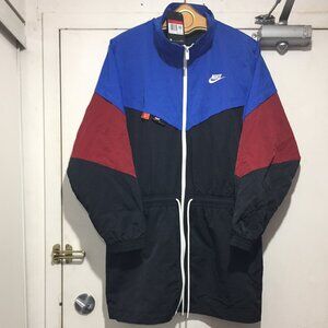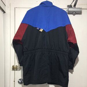 Nike Tall Jacket, Lightweight Size L, Black, Blue, Red Colorblock, 100% Nylon, Lining 100% Polyester Mesh, Side Pockets, Waist Elastic, Drawstring, Closure Zipper, Good Condition, Brand New, Great Jacket, Great Look, Great Fit.
