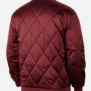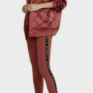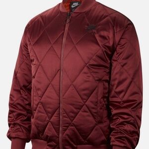 Quilted satin finish Nike Bomber jacket rose gold. Inside lining orange with embroidery along the inside zipper panel. Fits oversized.