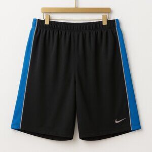 Comfortable Nike DriFit shorts for active kids. Sleek black with blue accents. Elasticized waist; inner drawstring. Zippered key pocket at back. Ideal for sports and play.