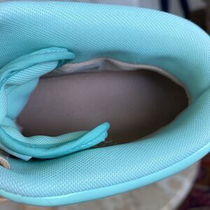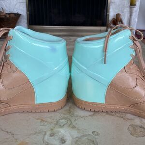 In excellent preowned condition cool NIKE women’s Dunk Sky HI VT QS Wedge sneaker featuring neutral Vachetta leather and Arctic Green patent leather. These rare vintage heeled sneakers are clean with barely any signs of wear. Small dark mark on top ankle (see last photo).