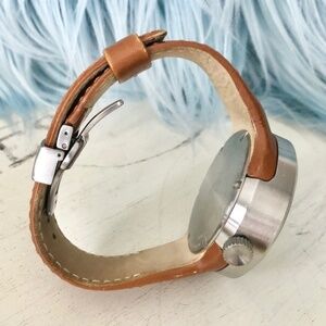 * Does contain some scratches and scuffs, from normal wear, more so on the back of the watch/silver parts. The face looks pretty good, some wear on the leather band.