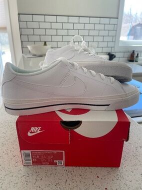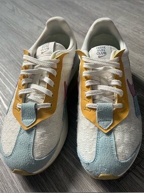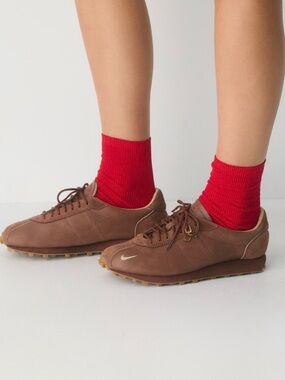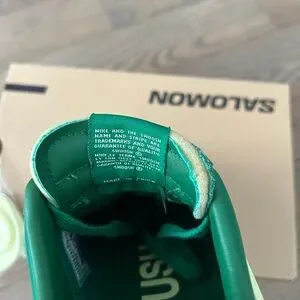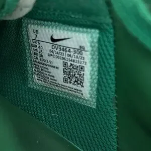 The sneaker features a textured upper of pine green leather. The shoe also has a matching rubber outsole with AIR cushioning. Variable-width lacing and perforations on the toebox are accented by a TPU heel clip. The signature Swoosh is elongated and appears in a citron - pale yellow - hue that is repeated on the lace dubrae, tongue tag, and heel tab in a leather material.”