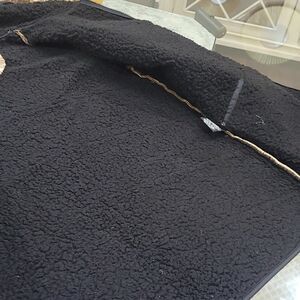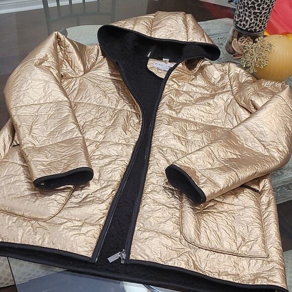 Nikki Jones Fall Stylish bronze Teddy jacket with hood and comfy faux shearling lining. Great transitional jacket. Patch pockets with zip front and hood. Fully lined and approx. 29 inches long with 25 inch sleeves. Pit to pit 24 aprox, sleeves 26in loose fit.