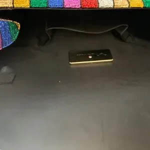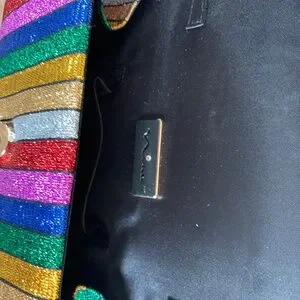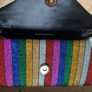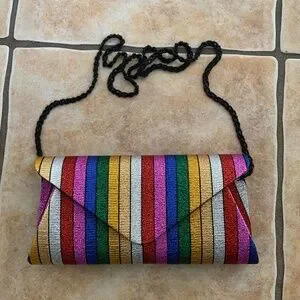 Removable shoulder strap. 2 compartments. Approx. size: 9" / 4.75". Glitter Fabric.
