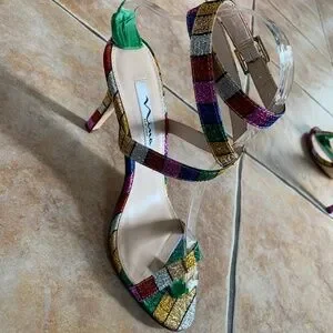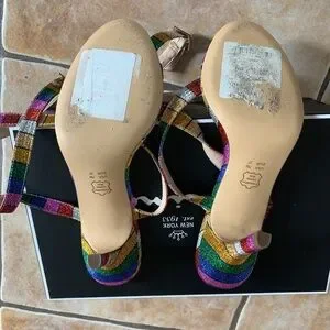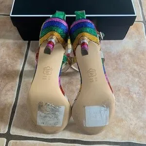 Adjustable ankle atrap. Padded Insole. Leather outsole. Synthetic lining. Heel Height: 3.5". Glitter Fabric.