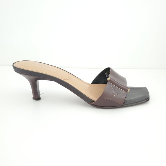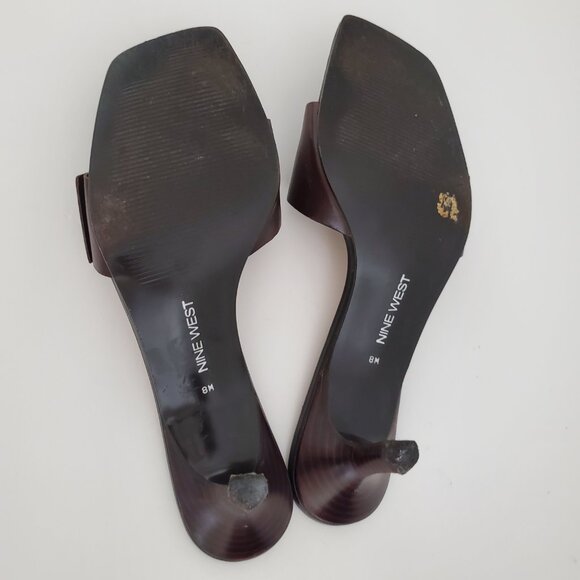 NINE WEST Brown Leather Heeled Slide Sandals Square Toe Bronze Buckle Accent 8M