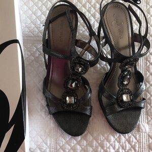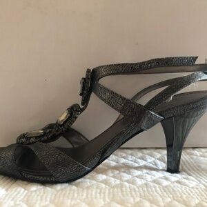Lovely NINE WEST dark silver sandals with rhinestones and buckled back strap. 3” heels with slight scrapes on the back. In original box. Perfect for summer or a wedding! Size 7